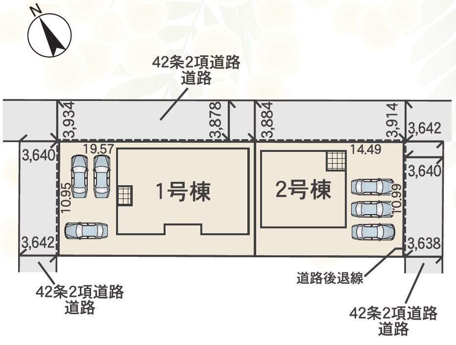 北側幅員約3.9m公道に約19.57m接道 西側幅員約3.6m公道に約10.95m接道 |
